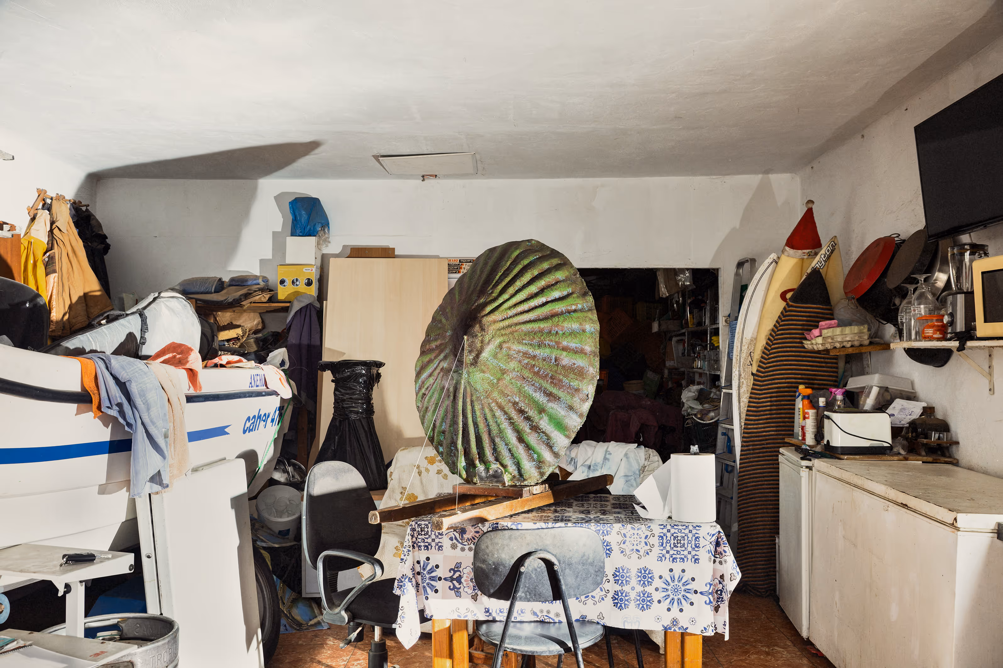 Rafael Arocha permite que los colores de sus fotografías brillen y bailen. Hay una extraña sensación de movimiento, como las imágenes del libro que sostiene el protagonista del cuento La puerta en el muro de H. G. Wells, que se cuela en un jardín tras una puerta misteriosa en un muro. En una de las fotografías de Arocha, unas escaleras rojas conducen a una casa pintada de blanco, aseguradas por una barandilla que parece ser una valla municipal incorporada en lo doméstico, que bien pudieran ser un portal hacia el animismo vernáculo ―como en el libro raro de Wells― de lo que acontece delante del objetivo de Rafael. La puerta ‘mágica’ se me antoja pues traducida al cosmos caótico-urbano de los barrios canarios, donde el eclecticismo arquitectónico ha cimentado un paisaje de fantasías sociales, mezclando una miríada de materiales y técnicas, como en los bellos cuadros de casas autoconstruidas de Ángel Padrón.